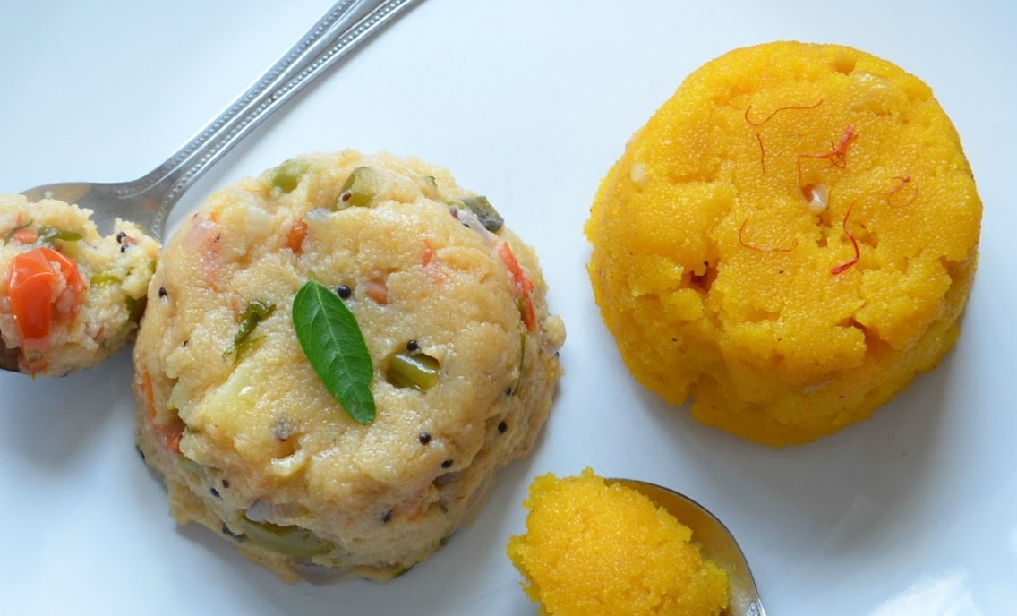 Chow Chow Bhath is a two in one dish, sweet and spicy, namely, Kesari Bath (Halwa) and Khara Bhath (Upma), where the main ingredient preparing these two dishes is semolina.
